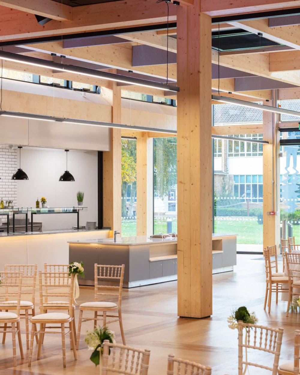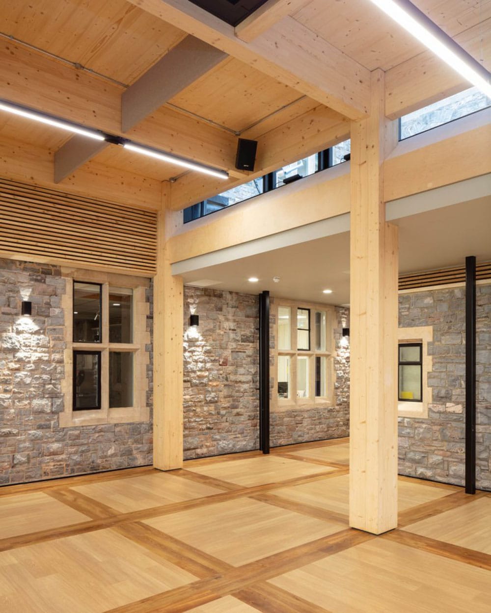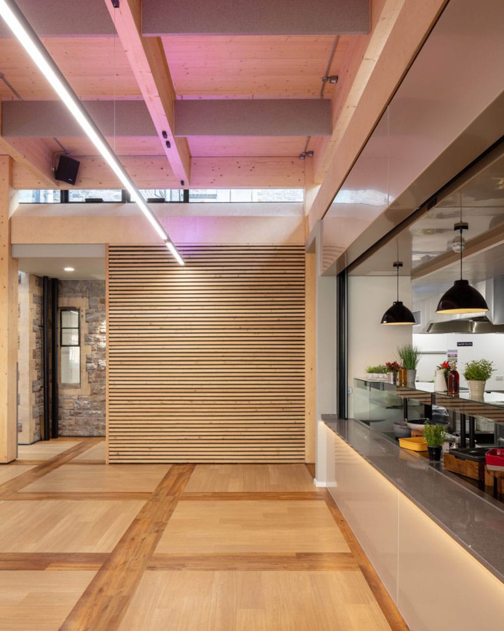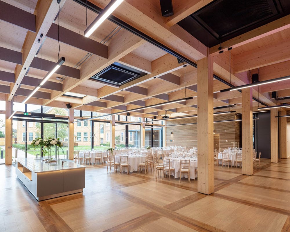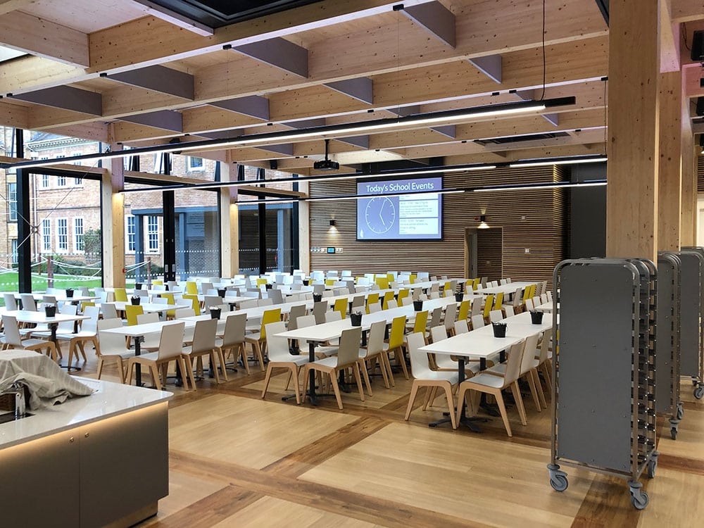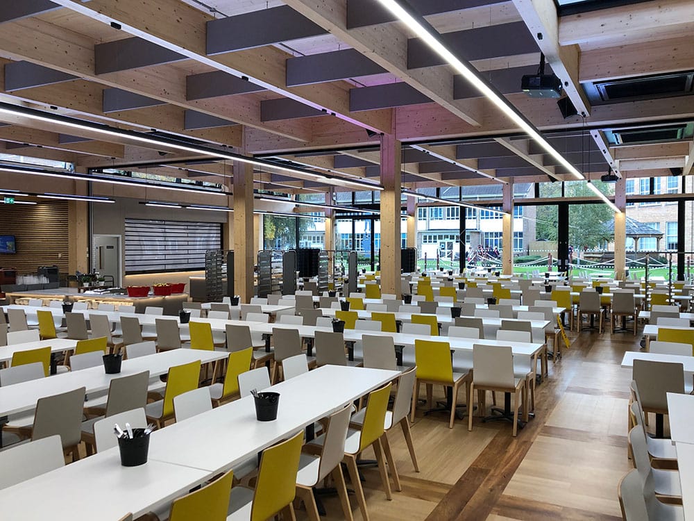 Sustainable materials were used and this material is accentuated by a continuous suspended linear luminaire which has an RGBA indirect light, 4000k direct distribution and is controlled by Casambi wireless lighting controls. This gives the school maximum flexibility when hiring out any part of this area to the public.